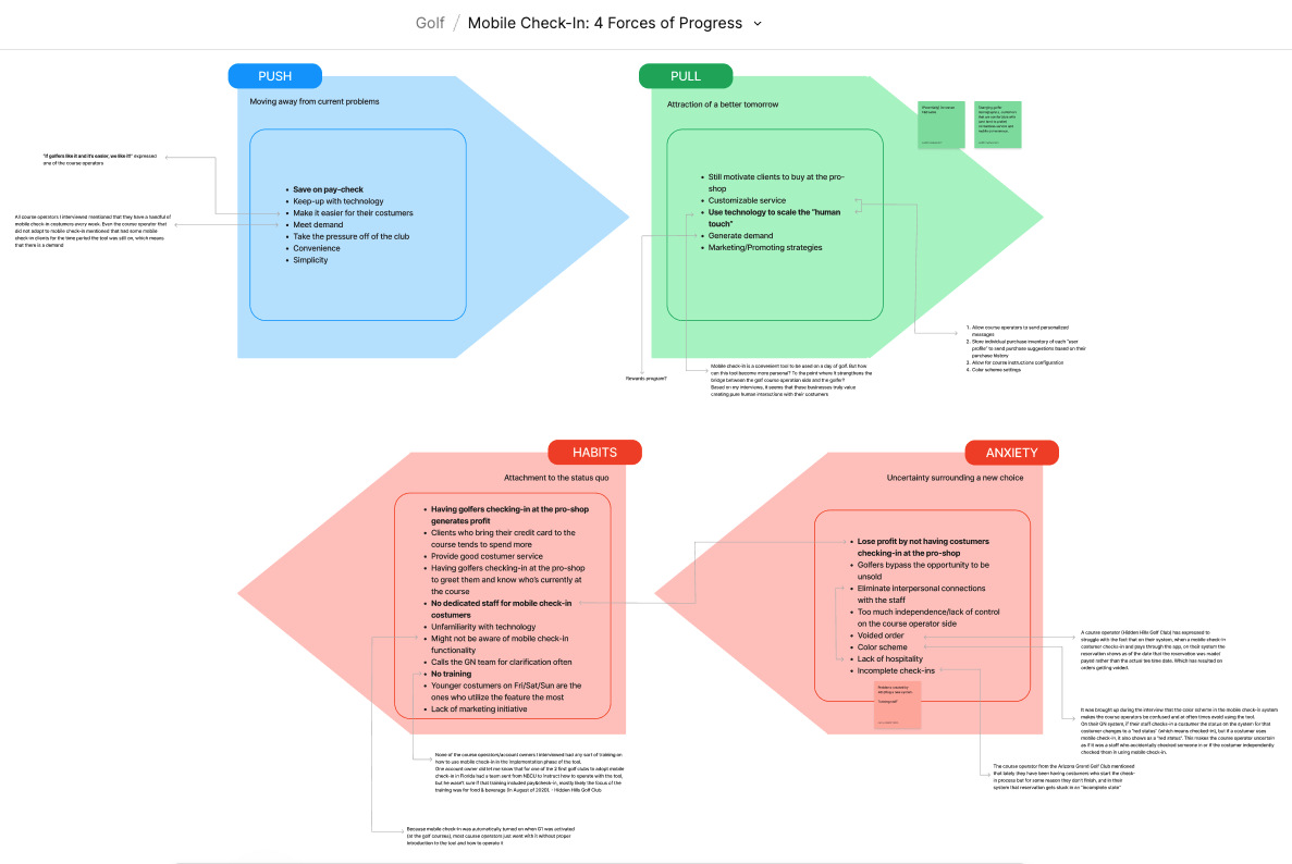 Our field research showed that the golfer experience goes beyond check-in, extending through all interactions with course staff, and that a smooth experience for golfers relies on a positive experience for operators. While the designer finalized mockups, I conducted in-depth interviews with course operators to uncover challenges with mobile check-in and their workflows. Using open-ended questions and the 4 Forces of Progress framework, I gathered insights that helped remove adoption barriers and shape a strategy to encourage course buy-in.
